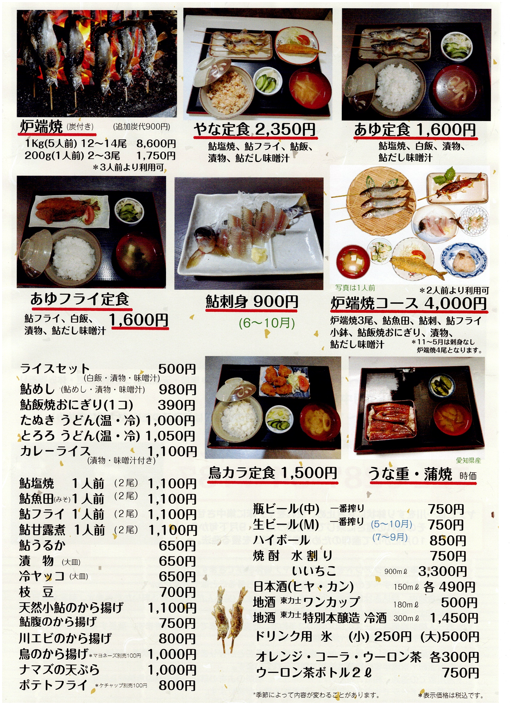 お食事は那珂川のアユやうなぎ、ナマズなどの他にも鳥のカラ揚げやエビフライなど魚以外のメニューも多く取り揃えています。
